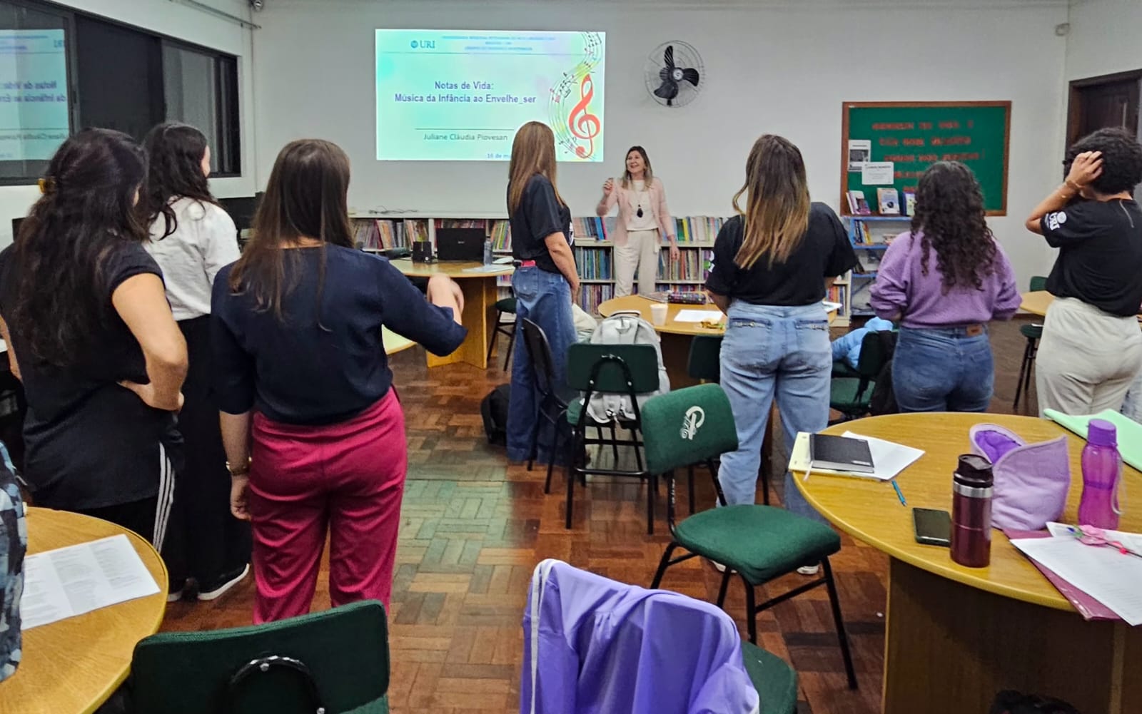O estágio de pós-doutoramento, com duração de doze meses, também promoveu um minicurso de 20h para acadêmicas do Curso de Pedagogia da URI, com foco na música como ferramenta educativa e intergeracional. A ação formativa aproximou universidade e comunidade, despertando nas futuras educadoras a sensibilidade e a ética necessárias para transformar a educação por meio da arte. As participantes vivenciaram práticas reflexivas e criativas, ampliando suas competências para planejar e conduzir atividades musicais em diferentes contextos e faixas etárias. Essa formação contribuiu para uma educação mais sensível, criativa e transformadora, em sintonia com os valores humanísticos da URI.