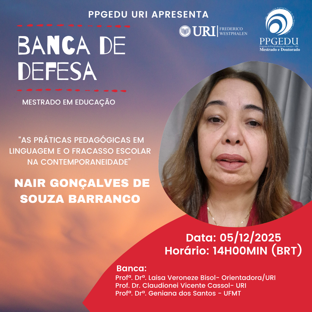 A mestranda NAIR GONÇALVES DE SOUZA BARRANCO apresentou o trabalho intitulado "PRÁTICAS PEDAGÓGICAS EM LINGUAGEM E O FRACASSO ESCOLAR NA CONTEMPORANEIDADE", que teve como banca os professores: Profª. Drª. Laisa Veroneze Bisol - Orientadora URI/FW, Prof. Dr. Claudionei Vicente Cassol - URI/FW Profª. Drª. Geniana dos Santos - UFMT.