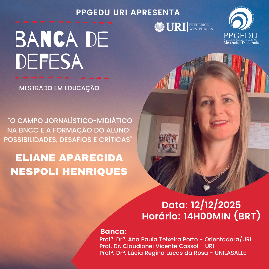 A mestranda Eliane Aparecida Néspoli Henriques apresentou o trabalho intitulado "O CAMPO JORNALÍSTICO-MIDIÁTICO NA BNCC E A FORMAÇÃO DO ALUNO: POSSIBILIDADES, DESAFIOS E CRÍTICAS" que teve como banca os professores Profa. Dra. Ana Paula Teixeira Porto - Orientadora/URI; Prof. Dr. Claudionei Vicente Cassol - URI; Profª. Dra. Lúcia Regina Lucas da Rosa - UNILASALLE.