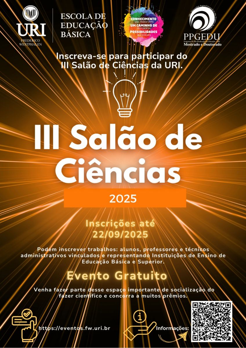 O conhecimento e a pesquisa ganharão destaque no Salão de Ciências da URI – Câmpus de Frederico Westphalen, que será realizado no dia 16 de outubro, nos três turnos, no Prédio 10 da Universidade. O evento reunirá mais de 300 trabalhos desenvolvidos por estudantes e professores, evidenciando o potencial científico e criativo da comunidade acadêmica.